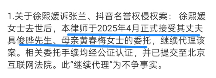 认真读一遍她的声明,脉络清晰,重点明确,主要讲的是她之前代理了大S的三起案件,现在其中两起不再继续,剩下的一起,即大S起诉张兰名誉侵权案,虽然原告已经离世,但是2025年5月受其丈夫具俊晔、母亲黄春梅(S妈)委托,仍在继续代理。
