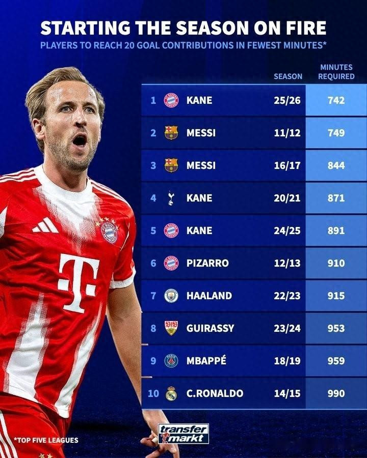 前五的梅西和凯恩,造进球20个都不到900甚至800分钟。从第六开始就超过900分钟了。第六到第十是五个不同的球员,没有梅西和凯恩,他们都在前五。第六是拜仁的披萨罗,2013赛季,910分钟。第七是2023赛季在曼城的哈兰德,915分钟。第八是斯图加特的吉拉西,2024赛季,953分钟。第九是当时在大巴黎的姆巴佩,2019赛季,959分钟。第十是2015赛季在皇马的C罗,990分钟。C罗垫底。